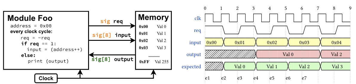 To illustrate this, consider the following example. The FOO module sends a read request (req) to a memory module and expects a response by reading the output signal. For clarity, the HDL code has been desugared into a software-style description. On the right, the waveform diagram shows the observed behavior of the system during simulation.